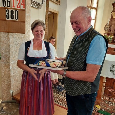 Eine weitere Ehrung nahm die Obfrau der Kirchengemeinschaft selbst vor, indem sie dem ehemaligen Leiter der Volksschule Tradigist, OSR Peter Hütthaler, für seine Verdienste um die Marienkapelle eine Urkunde überreichte, mit der ihm die Ehrenmitgliedschaft in der Kirchengemeinschaft verliehen wurde.