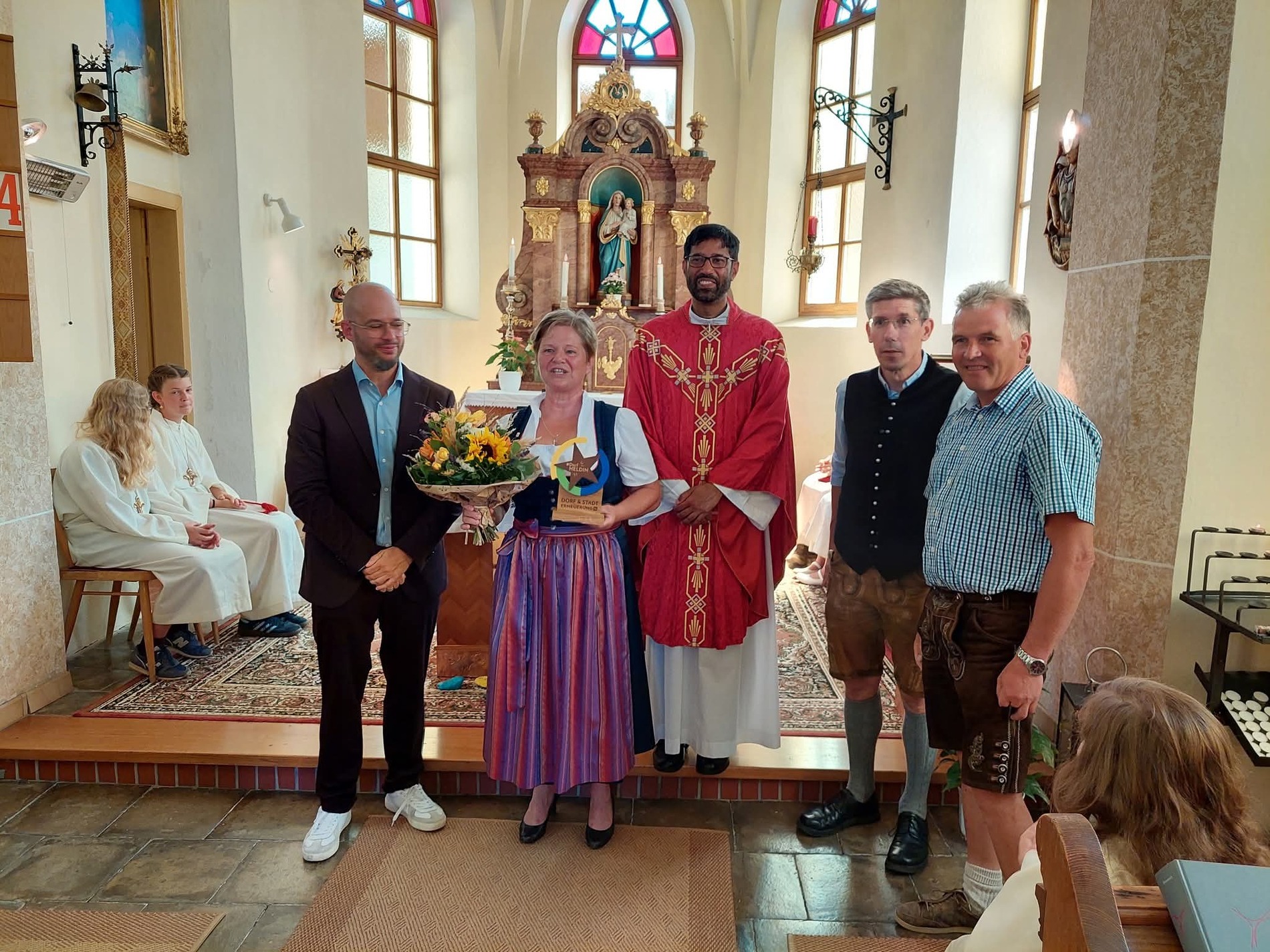 Nicht nur als Obfrau, auch als großartige Organisatorin und ebenso als Leiterin von Wortgottesfeiern in der Kapelle trägt Judith Gerstl einen wesentlichen Teil zum Zusammenfinden der Tradigister Dorfgemeinschaft bei. Dies blieb nicht unbemerkt, weshalb das Kirchweihfest einen würdigen Rahmen bildete, um der ehemaligen Kirchberger Gemeinderätin die Auszeichnung zur „Dorfheldin“ zu überreichen. Diese Ehrung wird von der Agentur der Niederösterreichischen Dorf- und Stadterneuerung an Menschen übergeben, die aufgrund ihres Engagements von der Gemeinde für dafür nominiert wurden. Bgm. Mag (FH) Martin Robausch aus Kirchberg und Vbgm. Karl Peter Bacher aus Rabenstein überreichten diese Auszeichnung, die sich Judith Gerstl wahrlich verdient hat.
