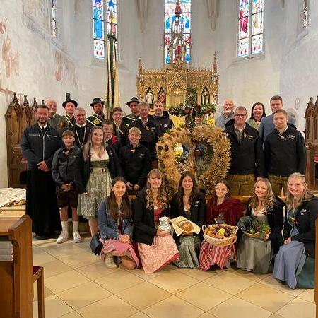Nach der Segnung der Erntekrone, die von der Landjugend geflochten wurde, zog der Festzug unter musikalischer Begleitung der Musikkapelle vom Innenhof des GuK zur Kirche, wo die Festmesse gefeiert wurde.