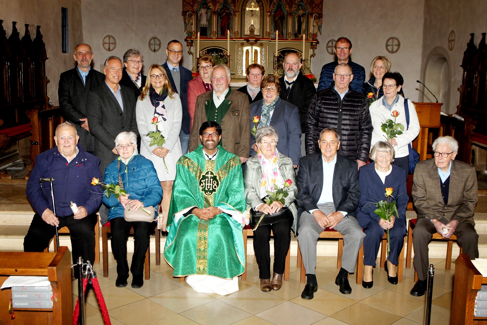 Die Jubelpaare mit P. Martin vlnr: Franz und Rosa Ruf, Vikar P. Martin, Christa und Günter Ihrybauer, Elfriede und Franz Wutzel. 2. Reihe: Peter und Barbara Seidl, Josef und Eva Reisenhofer, Josef und Aloisia Felberer. 3. Reihe: Franz und Ludmilla Hochebner, Herbert und Lucia Kaiser, Gabriele und Erwin Zagler, Rudolf und Alexandra Egger.