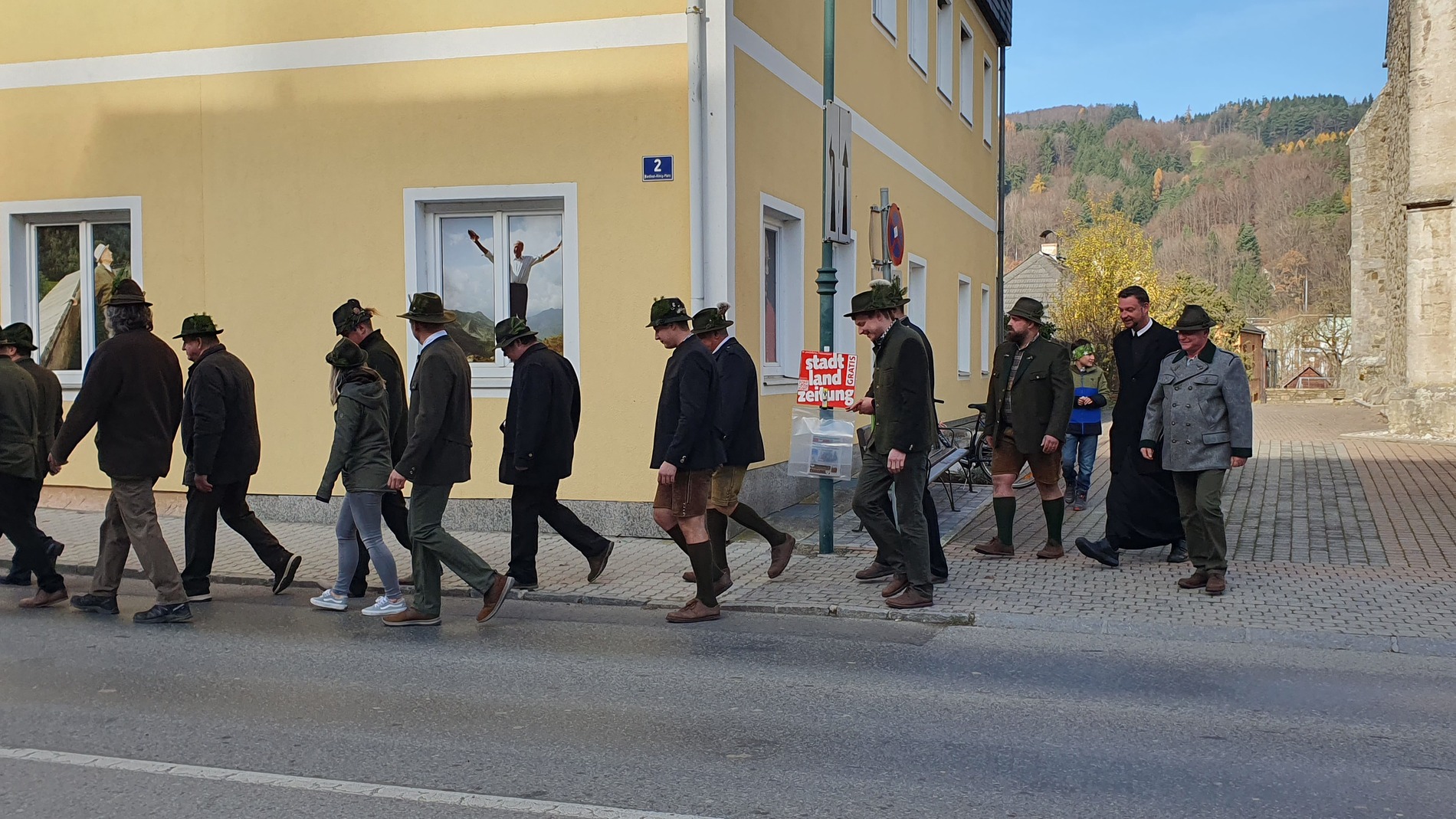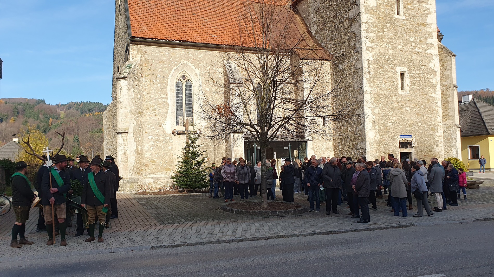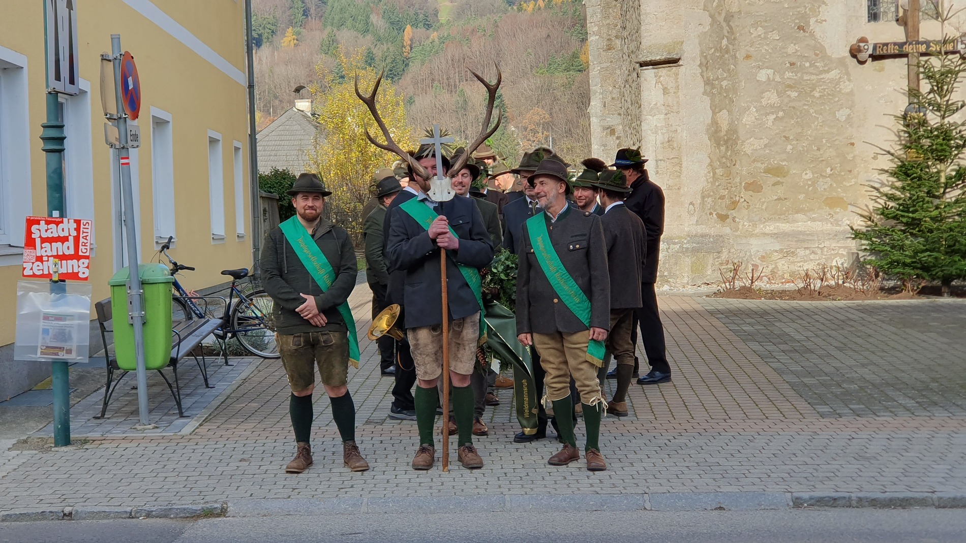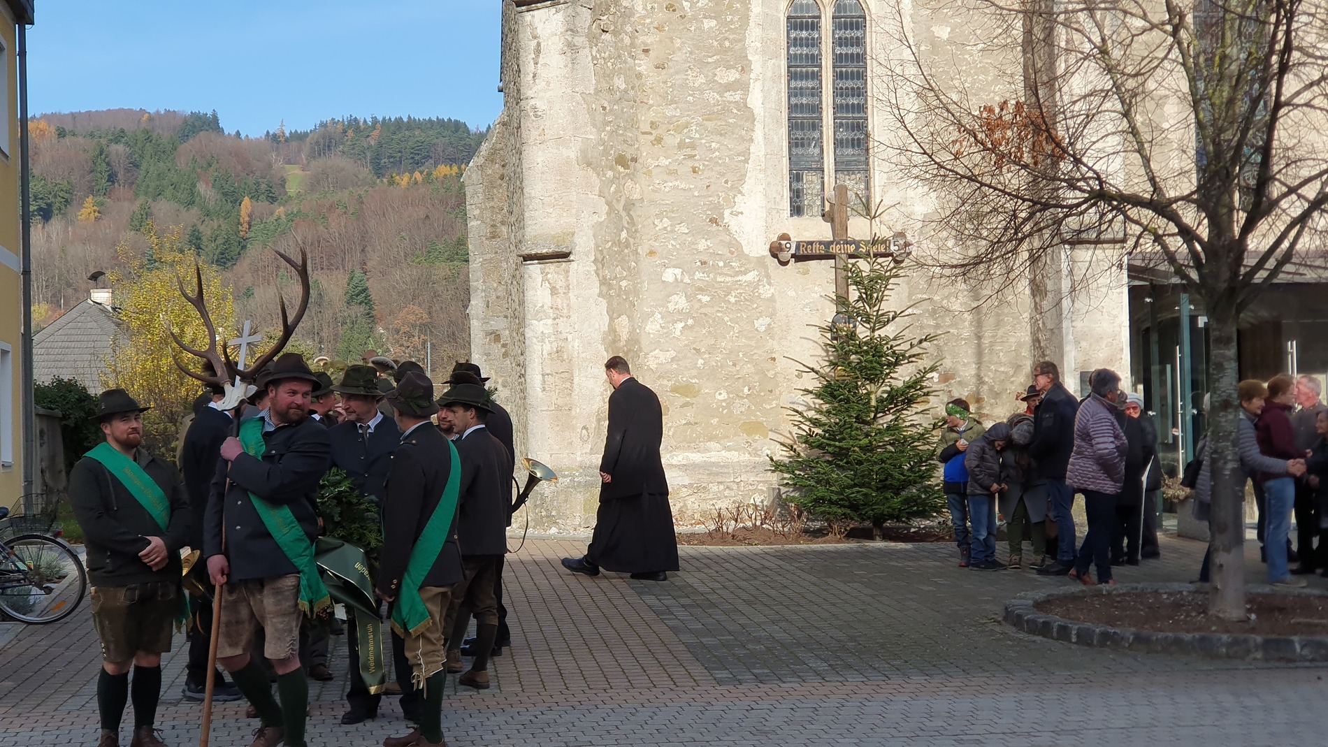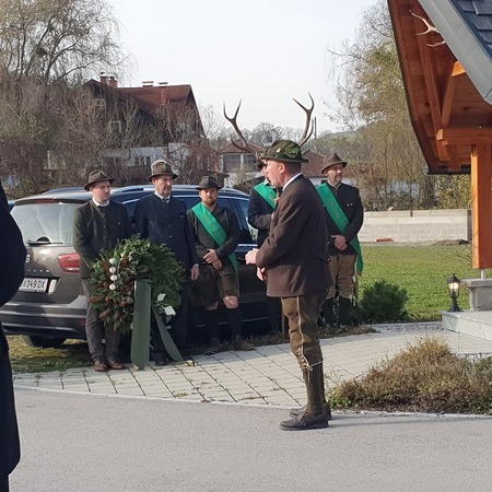 Nach dem Gottesdienst begab sich die Jägerschaft zur Hubertuskapelle, um ihren Schutzpatron zu ehren und der verstorbenen Mitglieder zu gedenken. Feierliche wurde ein Kranz niedergelegt.
