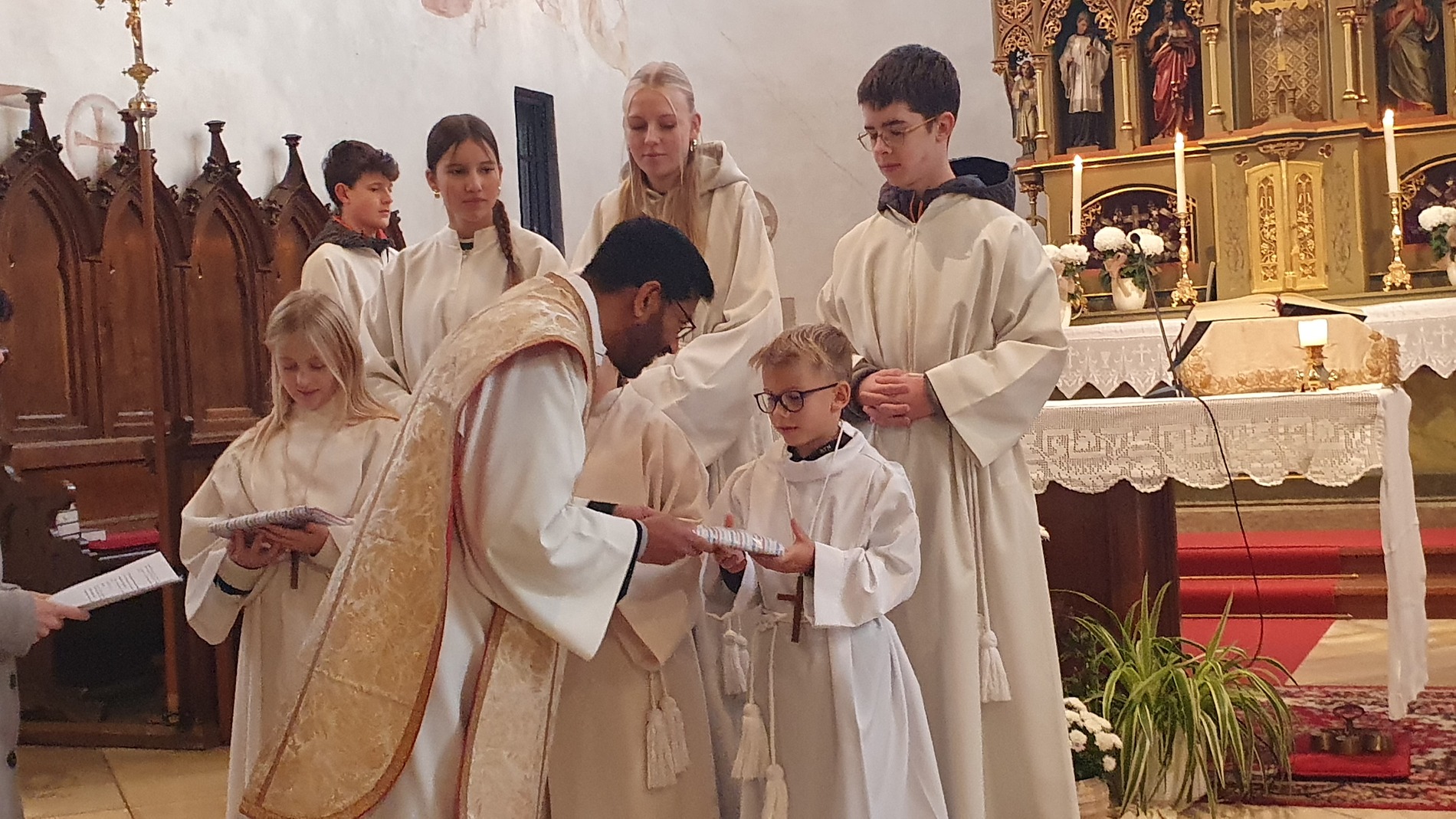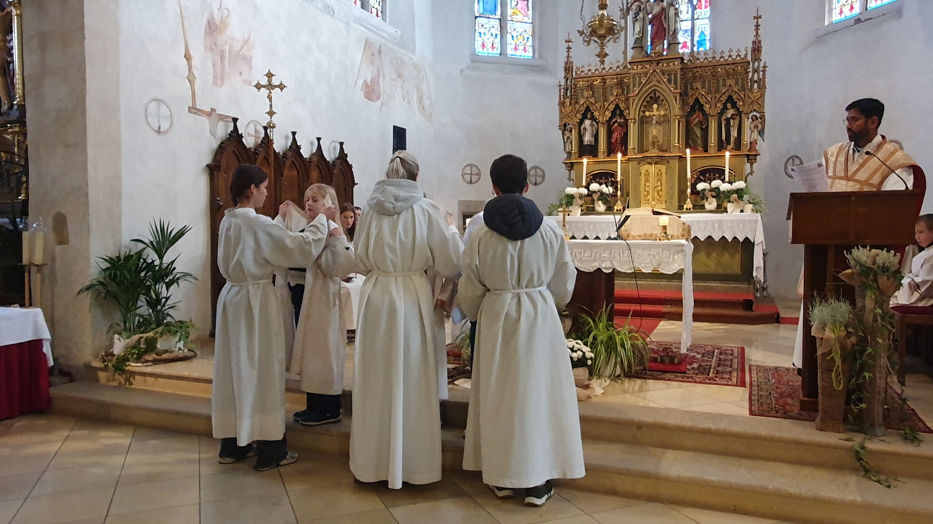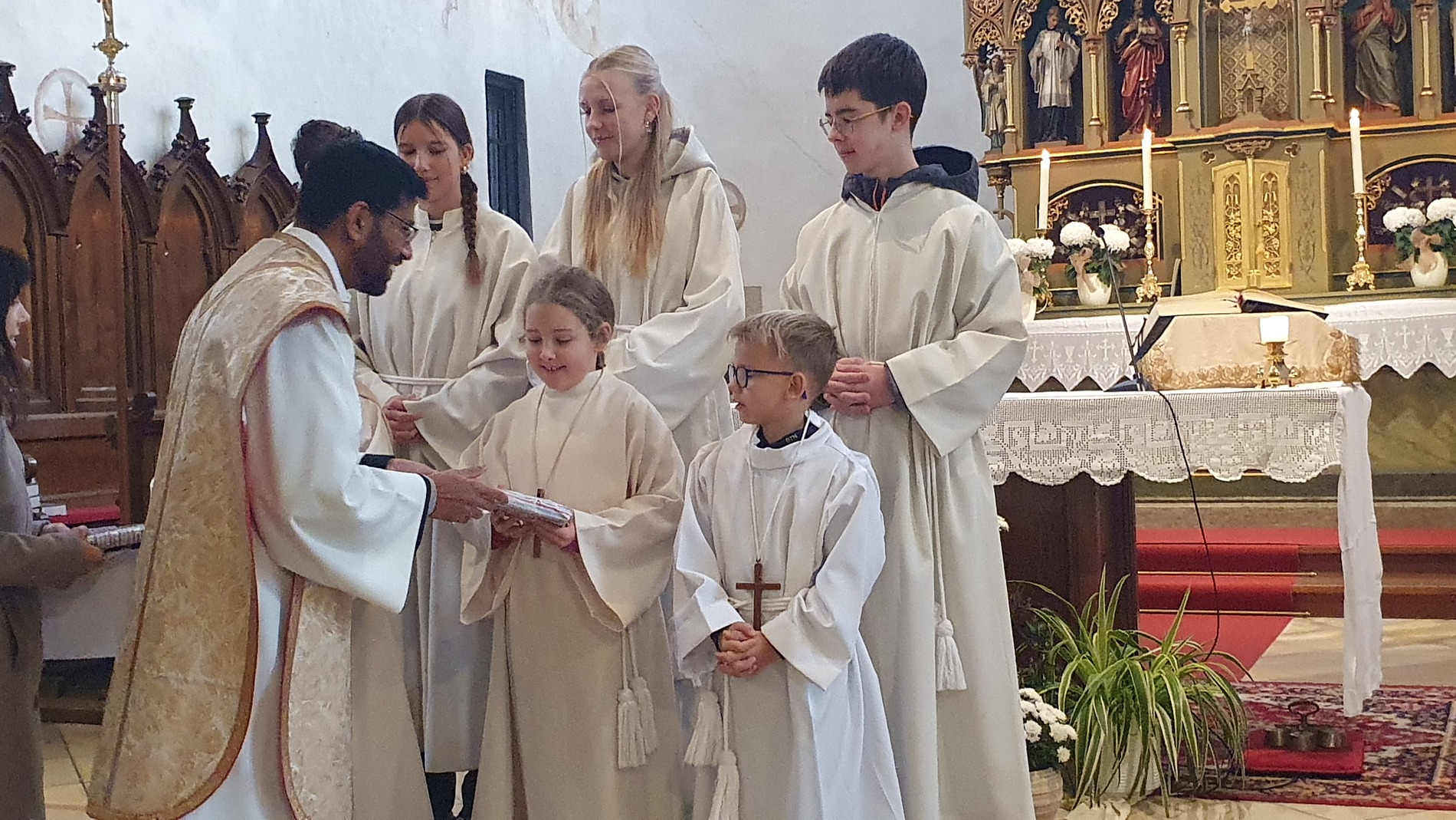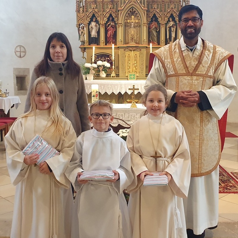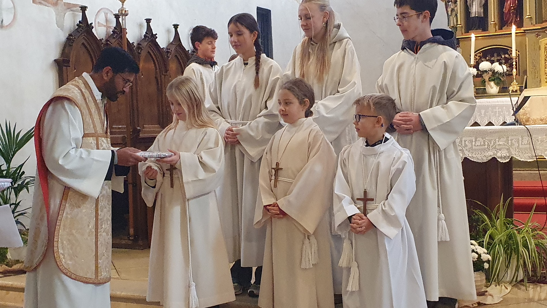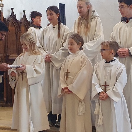 Im Rahmen des Gottesdienstes kleideten die großen Minis die Neuaufgenommenen ein. Vikar P. Martin überreichte ihnen das Minikreuz und ein Willkommensgeschenk. Er bedankte sich bei ihnen für ihre Bereitschaft Dienst am Altar zu tun.