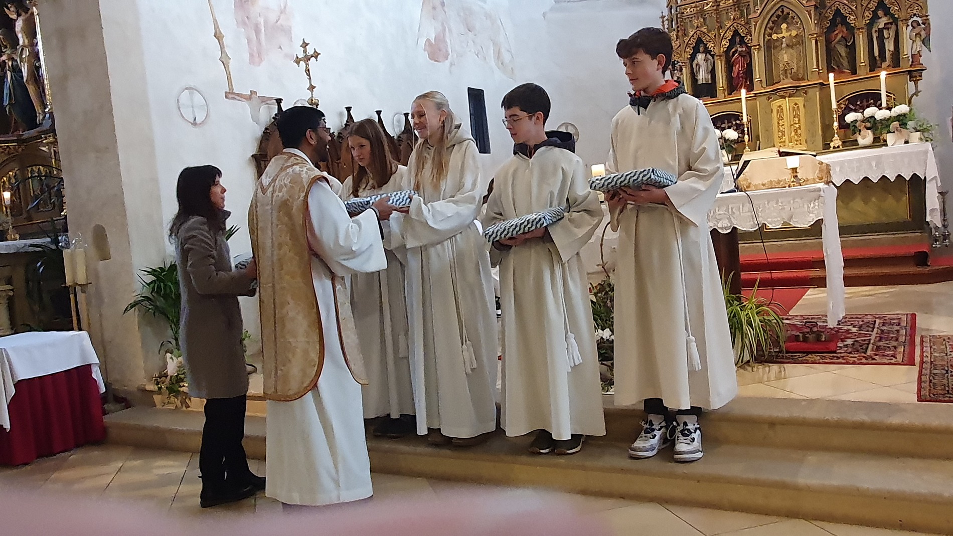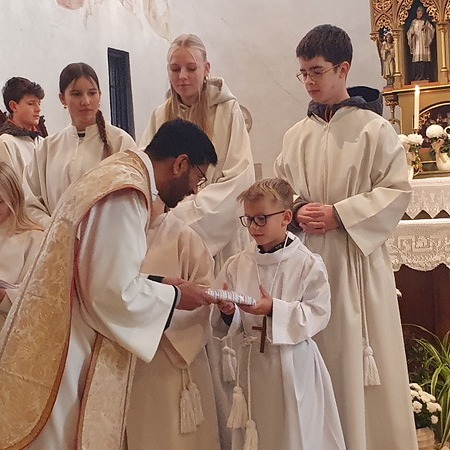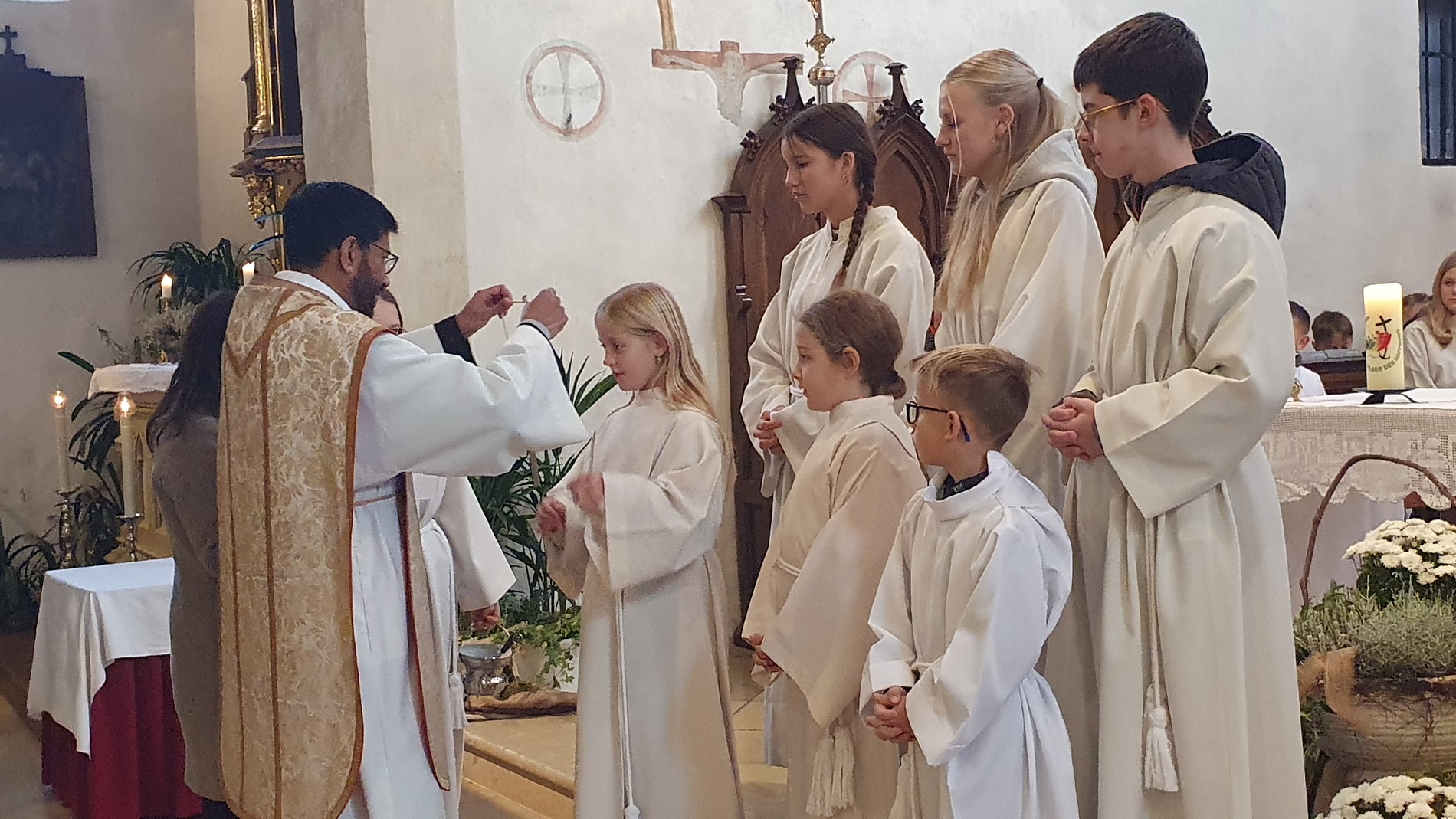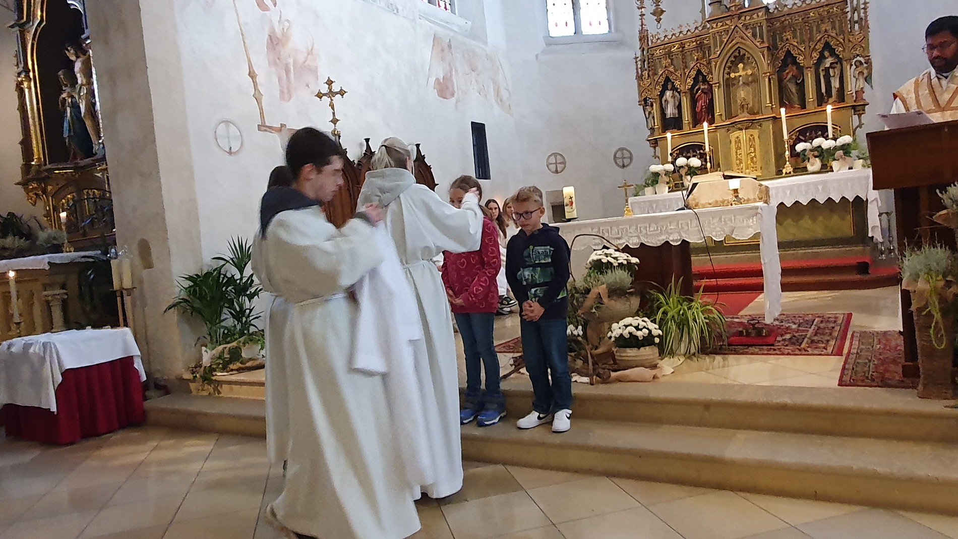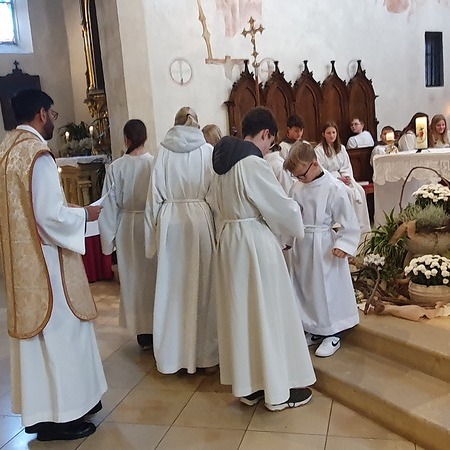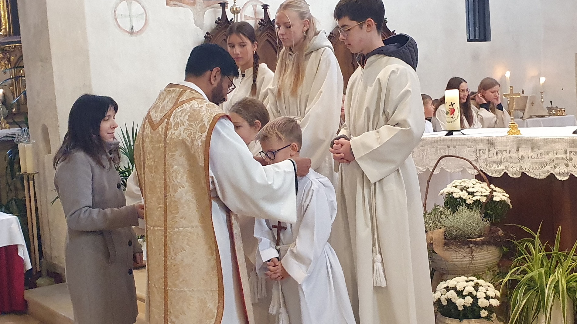 Im Rahmen des Gottesdienstes kleideten die großen Minis die Neuaufgenommenen ein. Vikar P. Martin überreichte ihnen das Minikreuz und ein Willkommensgeschenk. Er bedankte sich bei ihnen für ihre Bereitschaft Dienst am Altar zu tun.