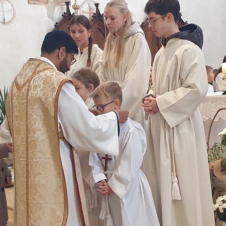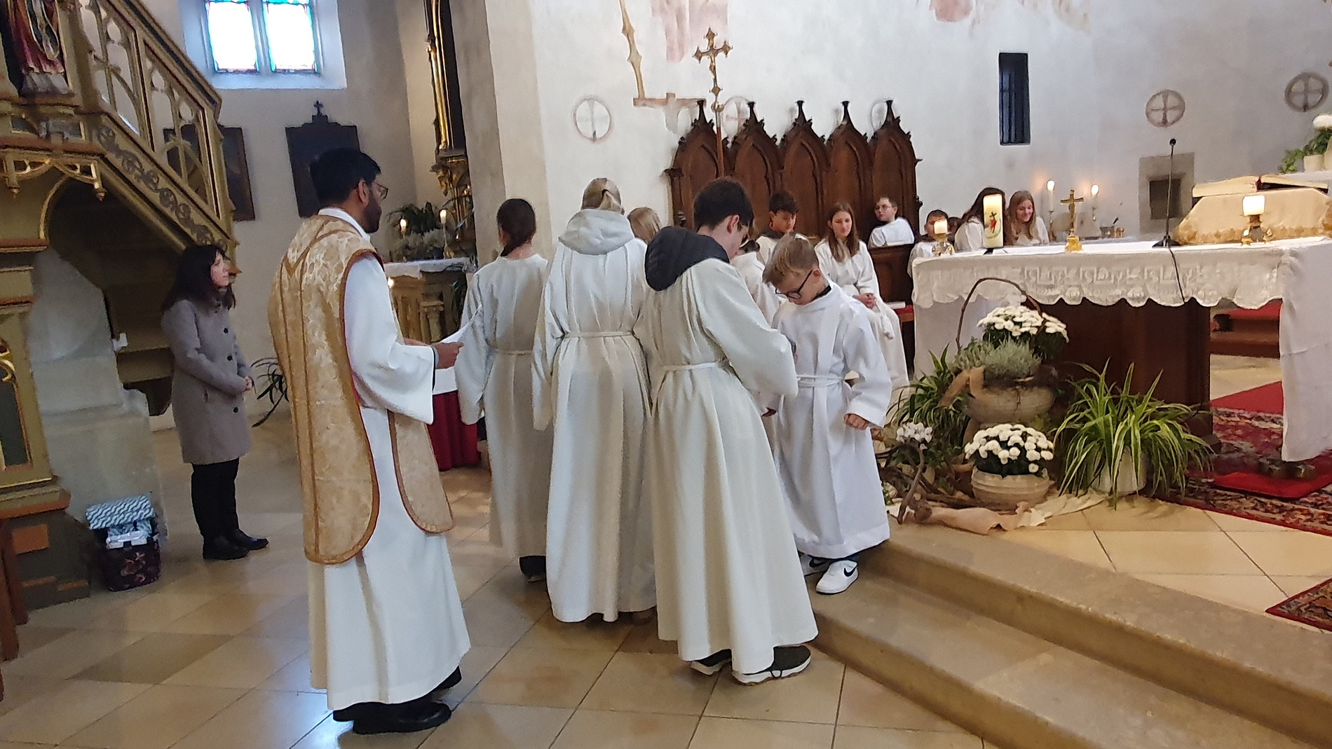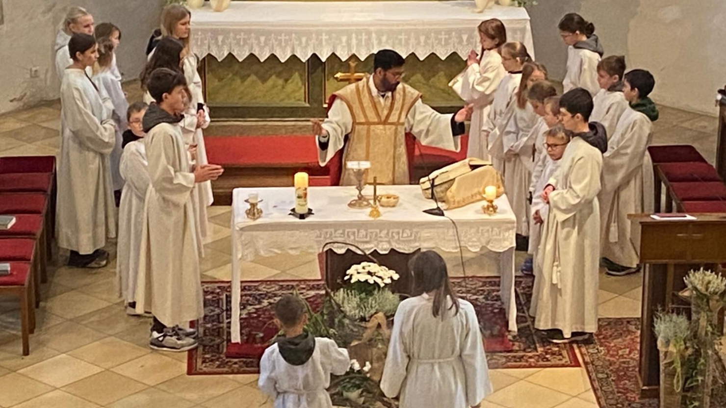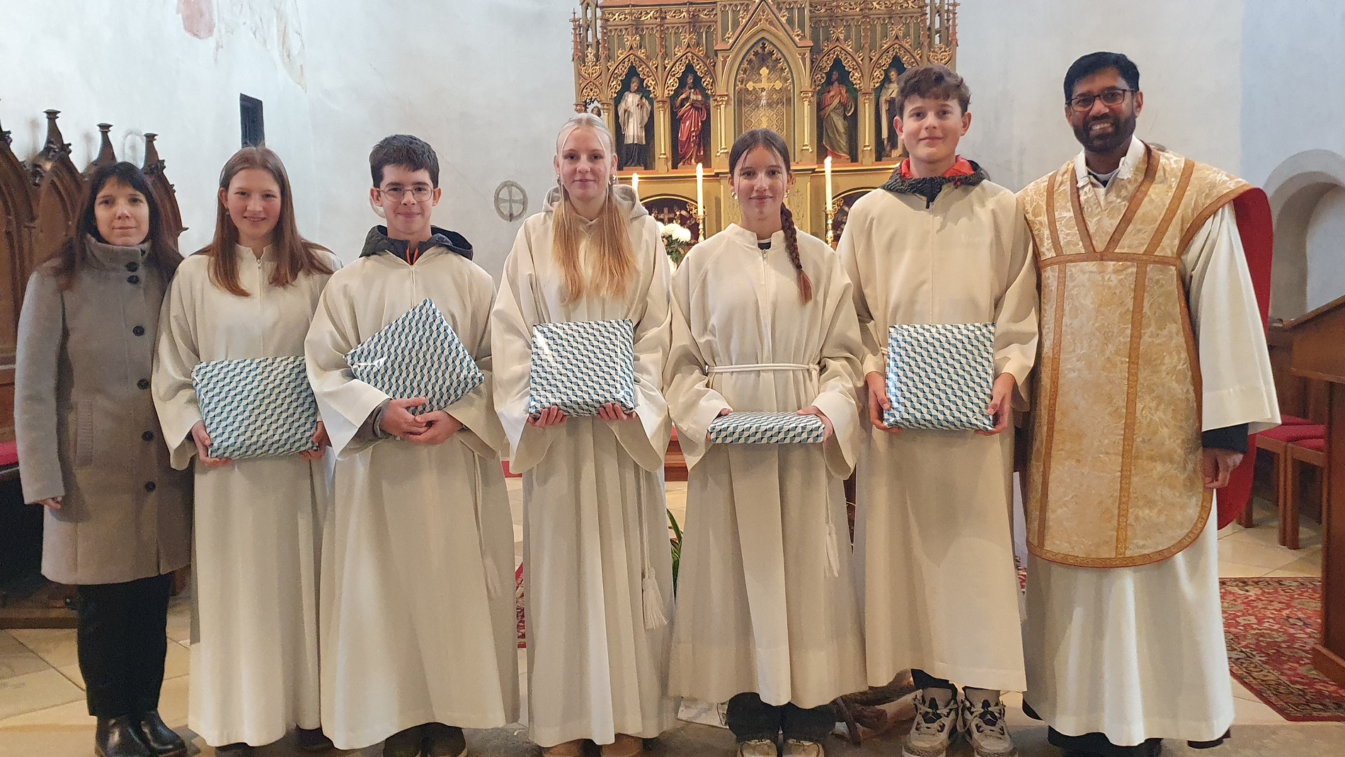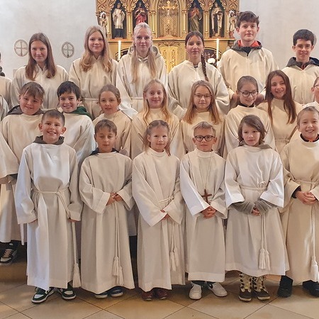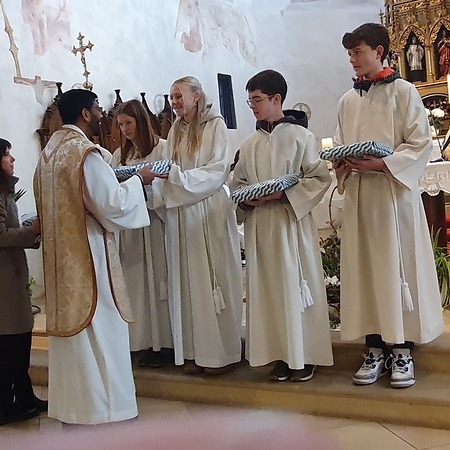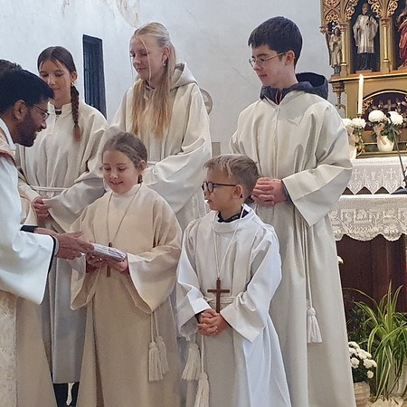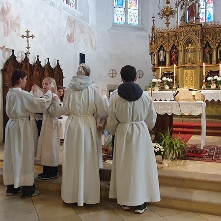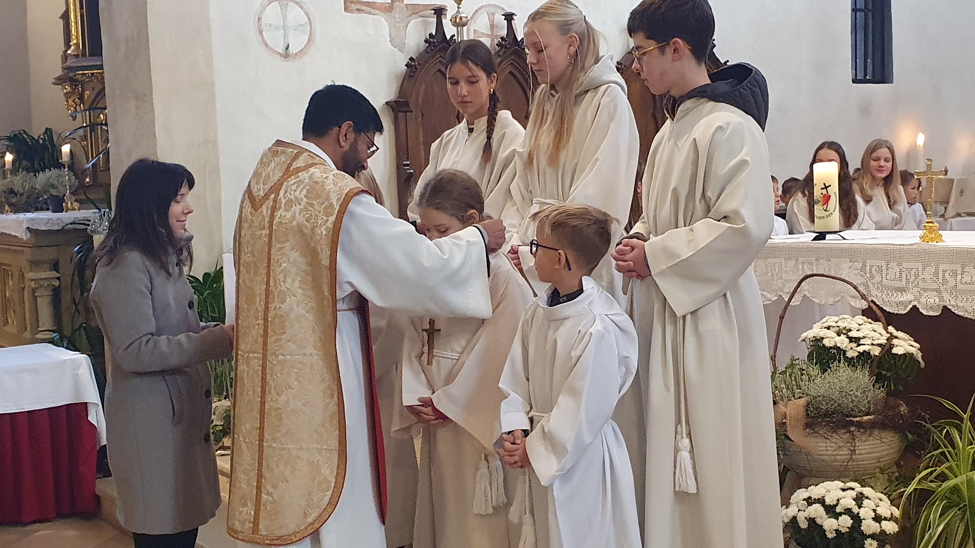Im Rahmen des Gottesdienstes kleideten die großen Minis die Neuaufgenommenen ein. Vikar P. Martin überreichte ihnen das Minikreuz und ein Willkommensgeschenk. Er bedankte sich bei ihnen für ihre Bereitschaft Dienst am Altar zu tun.