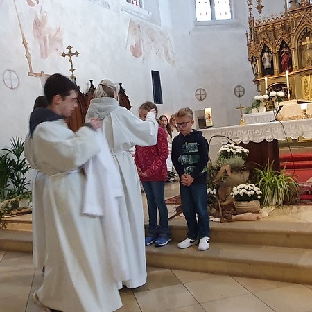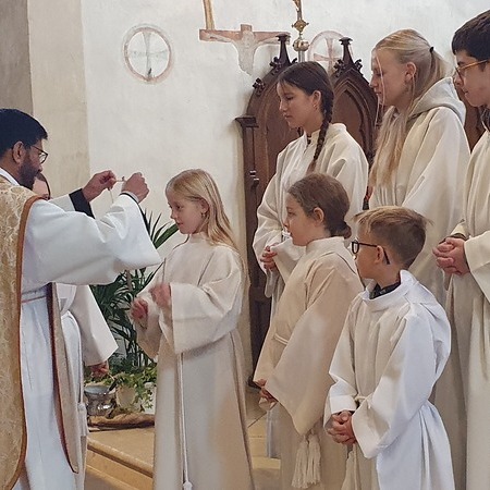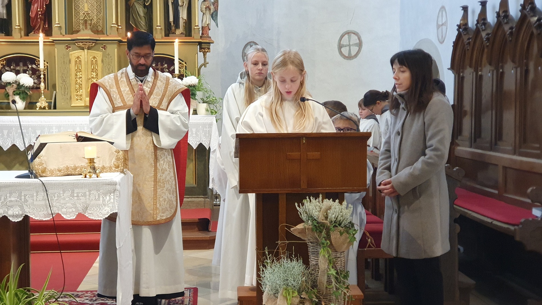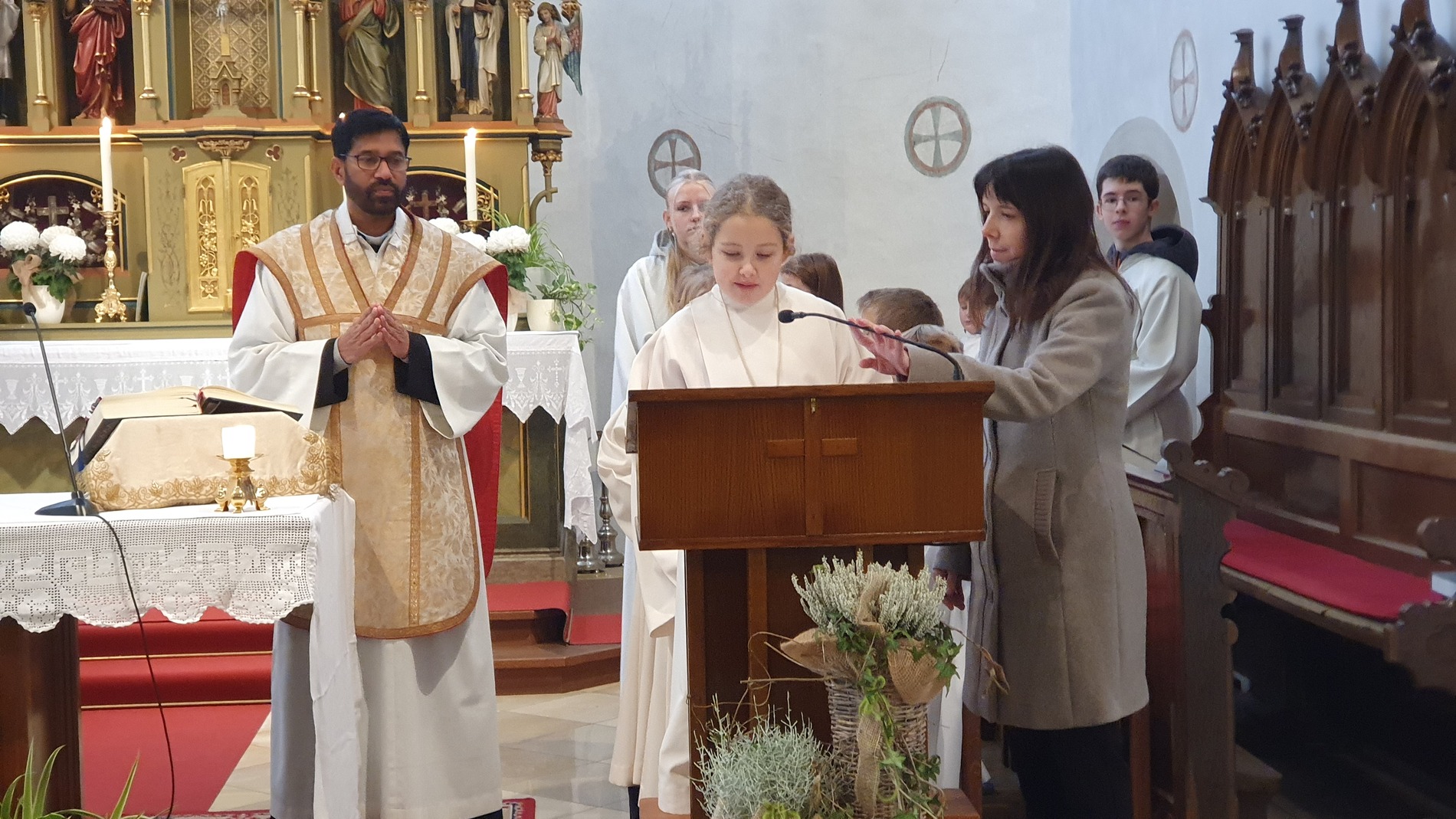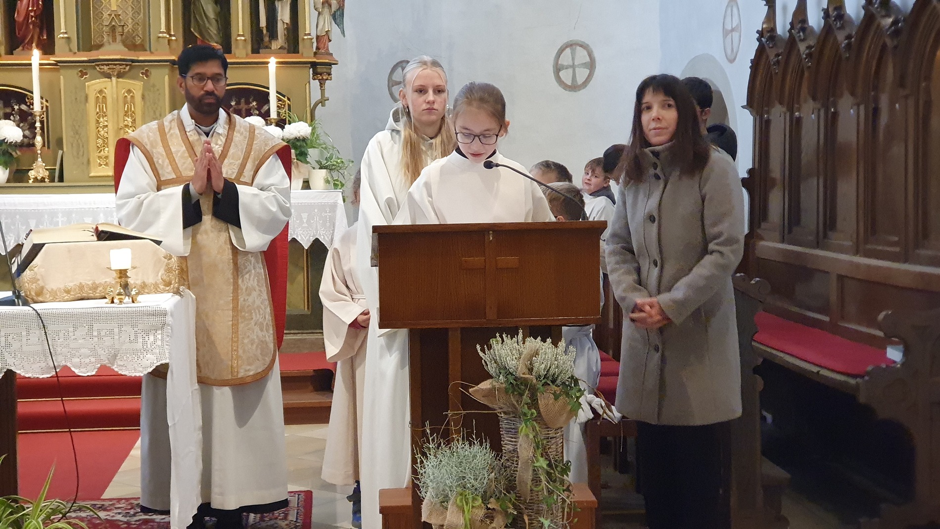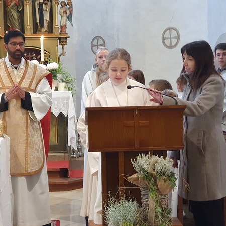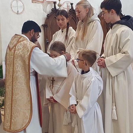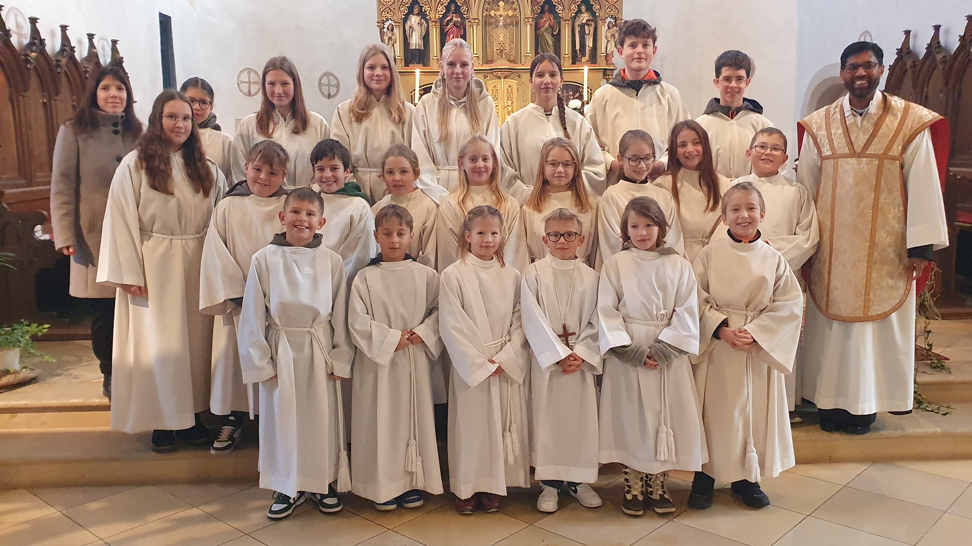 Im Rahmen des Gottesdienstes kleideten die großen Minis die Neuaufgenommenen ein. Vikar P. Martin überreichte ihnen das Minikreuz und ein Willkommensgeschenk. Er bedankte sich bei ihnen für ihre Bereitschaft Dienst am Altar zu tun.