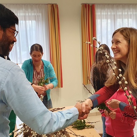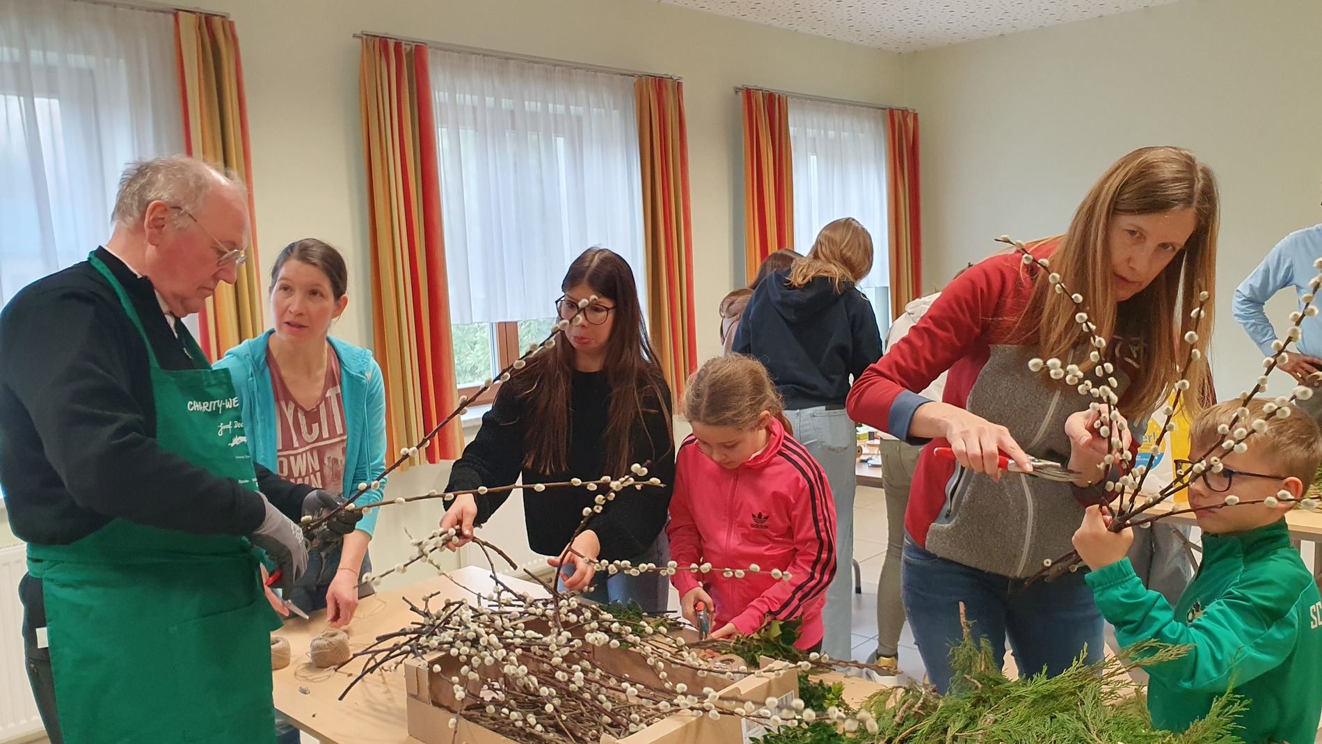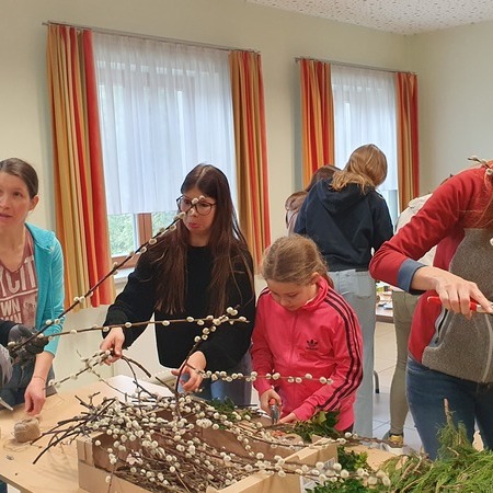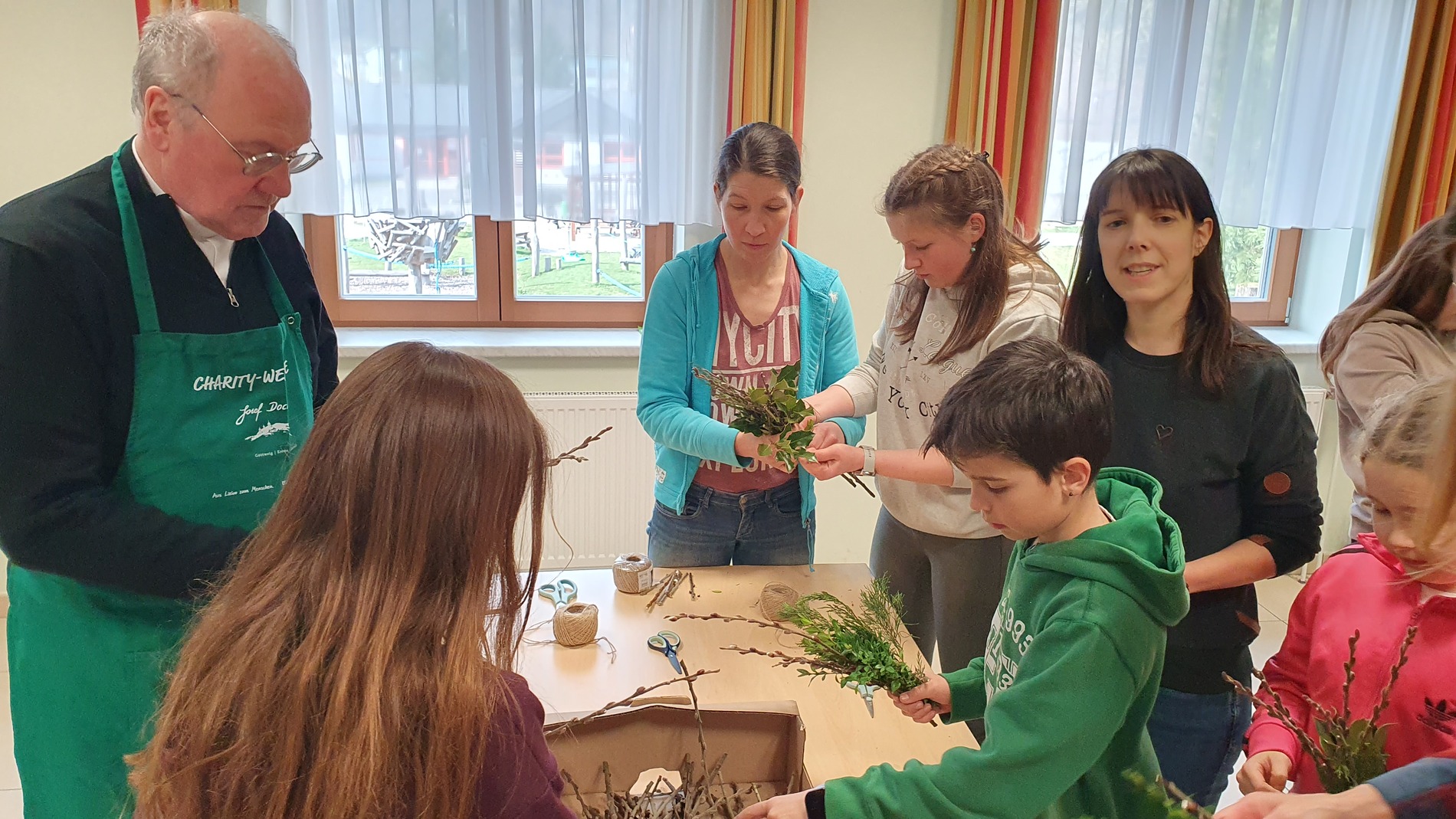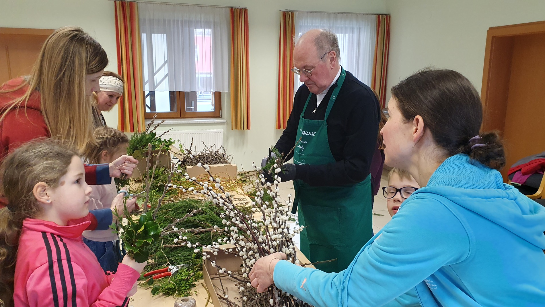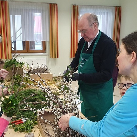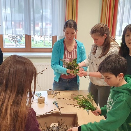 Michaela Riedl und ihr Betreuerinnenteam hatten bereits alles bestens vorbereitet: Palmkätzchenzweige, Buchsbaum und Bindfaden lagen bereit.