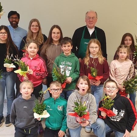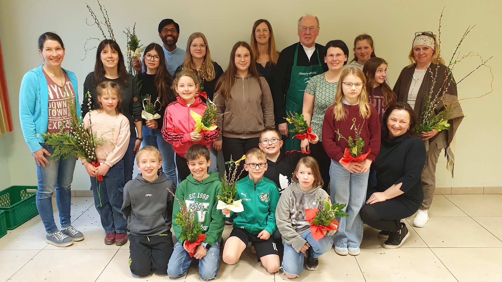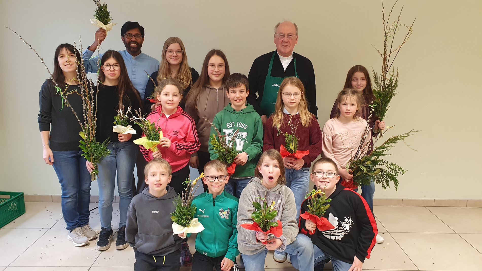 Zur Verstärkung kam auch Vikar P. Martin dazu. Am Ende konnten beeindruckende 109 Palmbuschen gezählt werden, die die Ministrantinnen und Ministranten am Palmsonntag zum Verkauf anbieten werden.