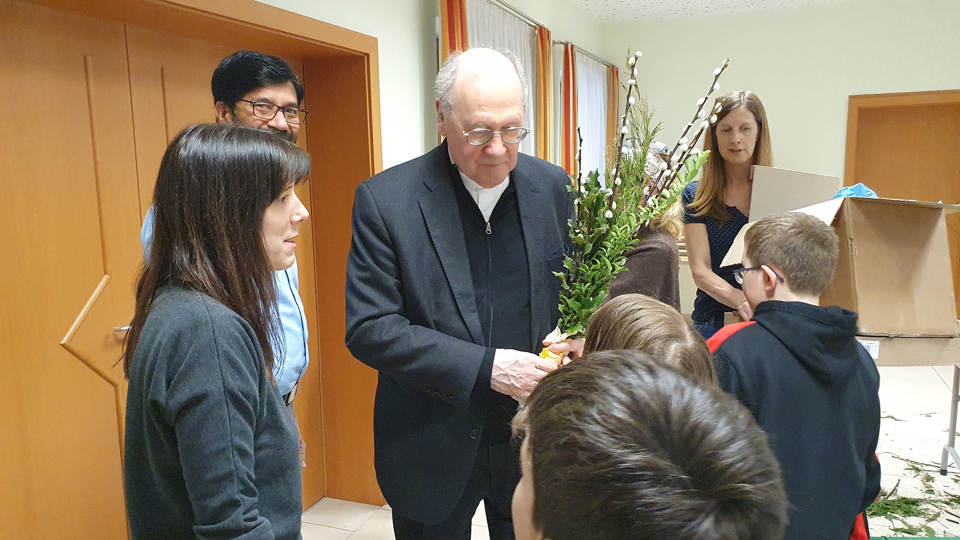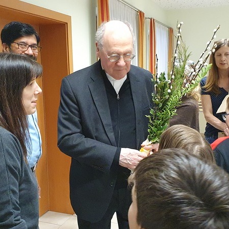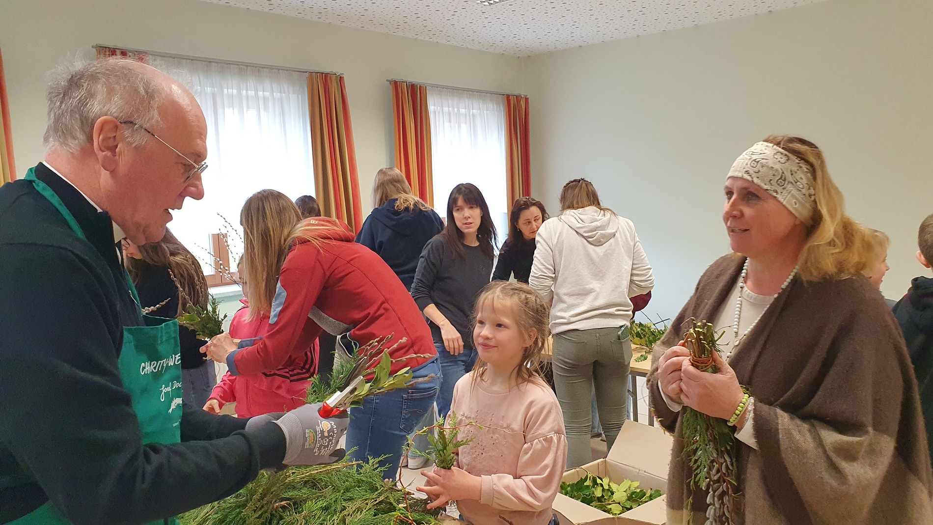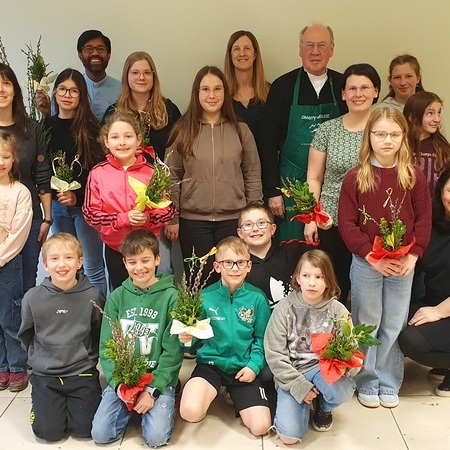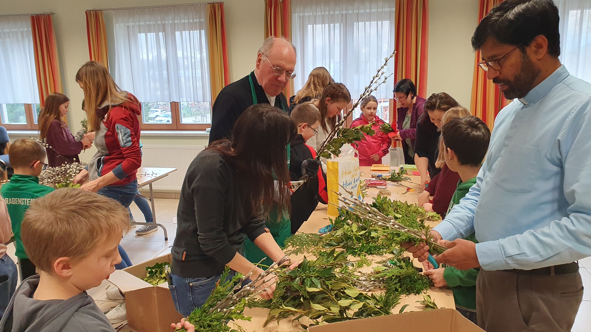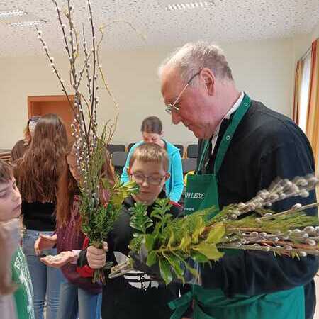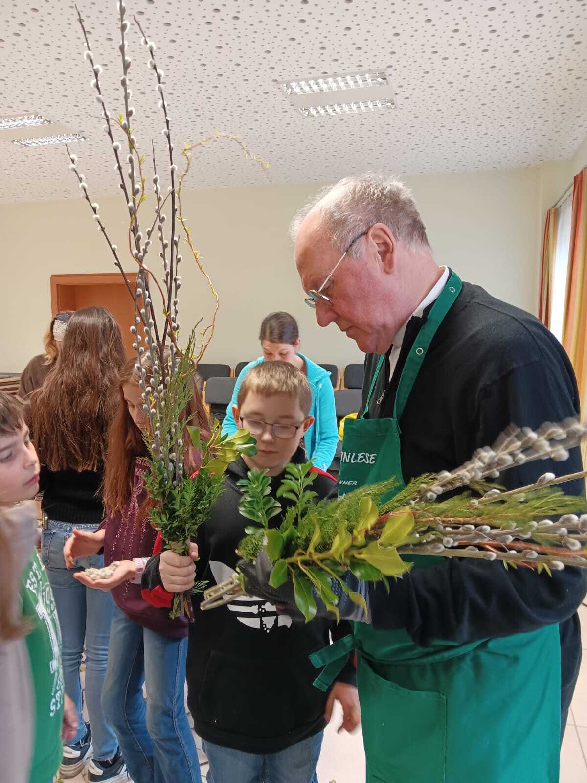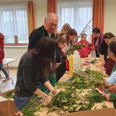 Mit viel guter Laune schnitt der Bischof gemeinsam mit den Ministrantinnen und Ministranten und ihren Betreuerinnen die Zweige zurecht. Die Palmkätzchen wurden mit viel Geschick zu schönen Palmbuschen gebunden. Dabei wurde eifrig geplaudert und auch viel gelacht.