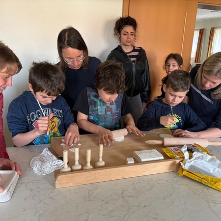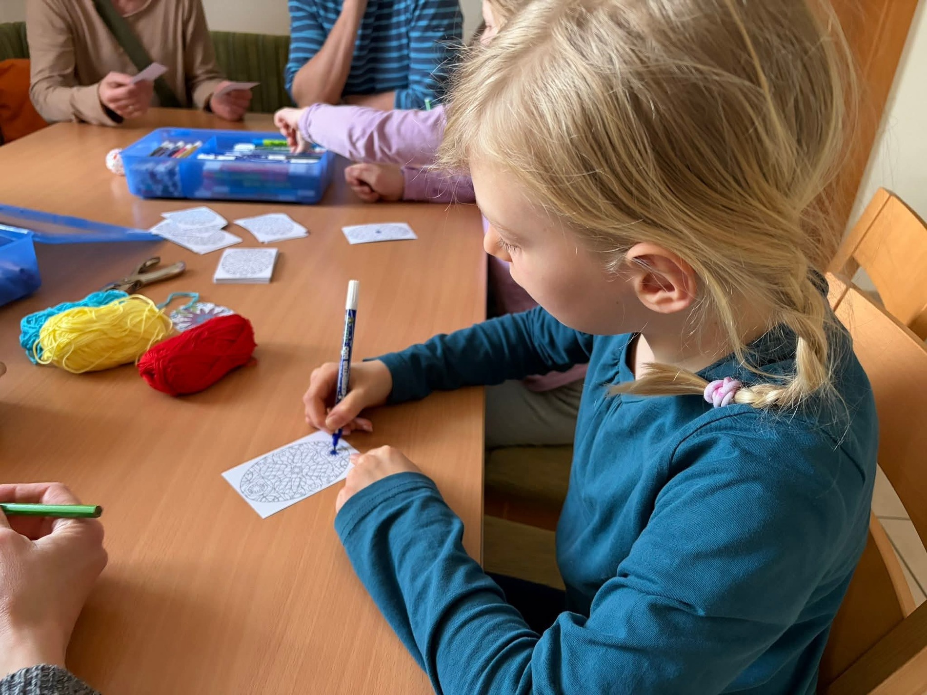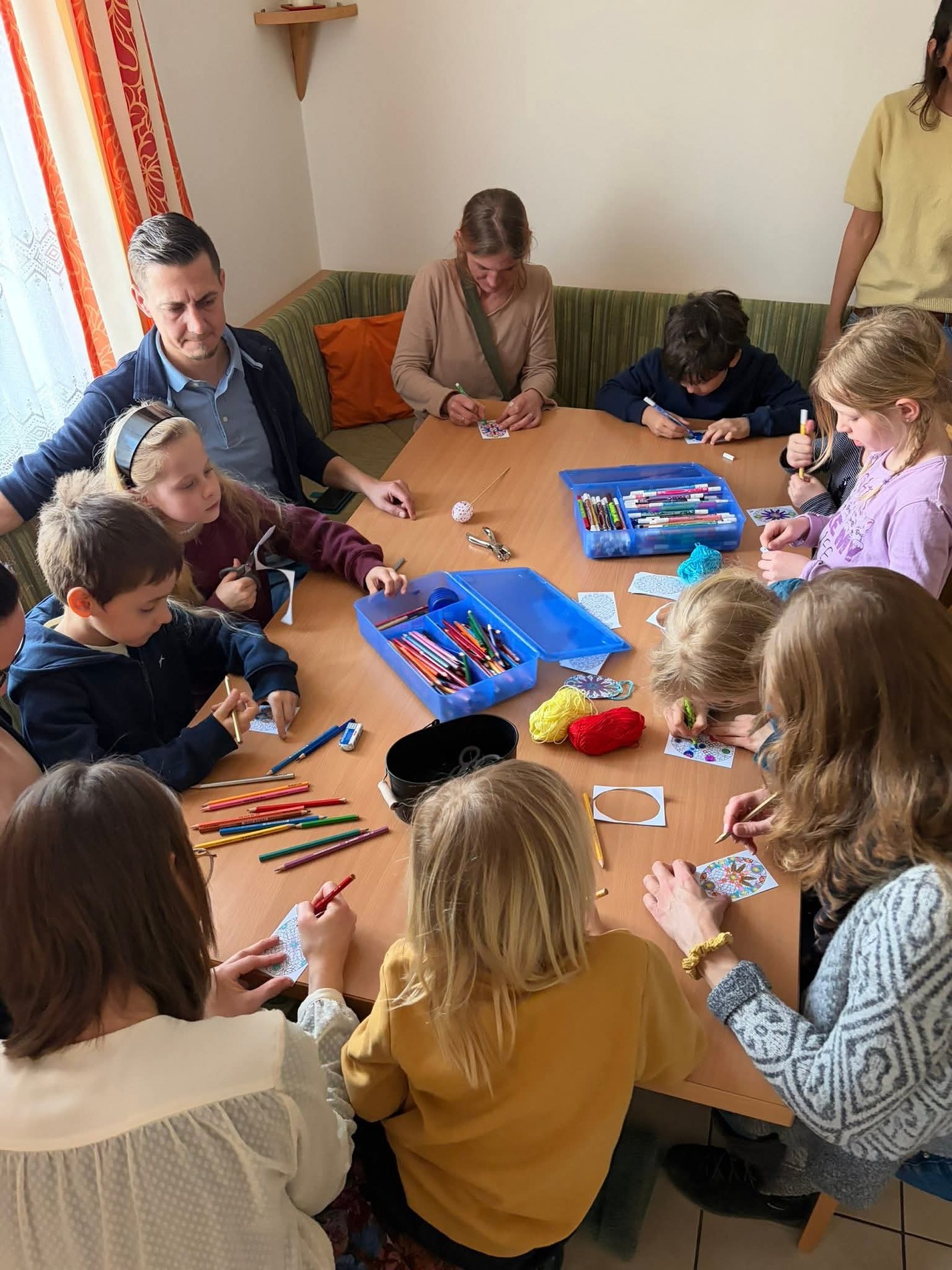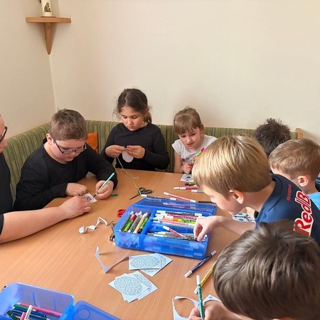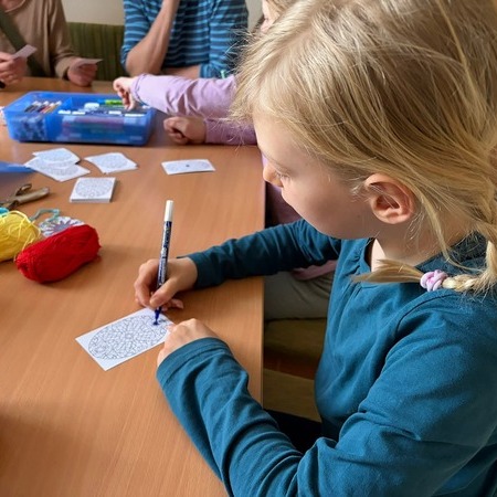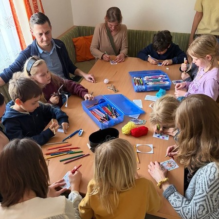 An verschiedenen Stationen wurde eifrig gewerkt: Es wurde gemalt, gezeichnet, gehäkelt, ausgeschnitten, gewalkt und gebunden. Die entstandenen Werkstücke präsentierten die Kinder schließlich in der Mitte des Raumes auf bunt gestalteten Tüchern.