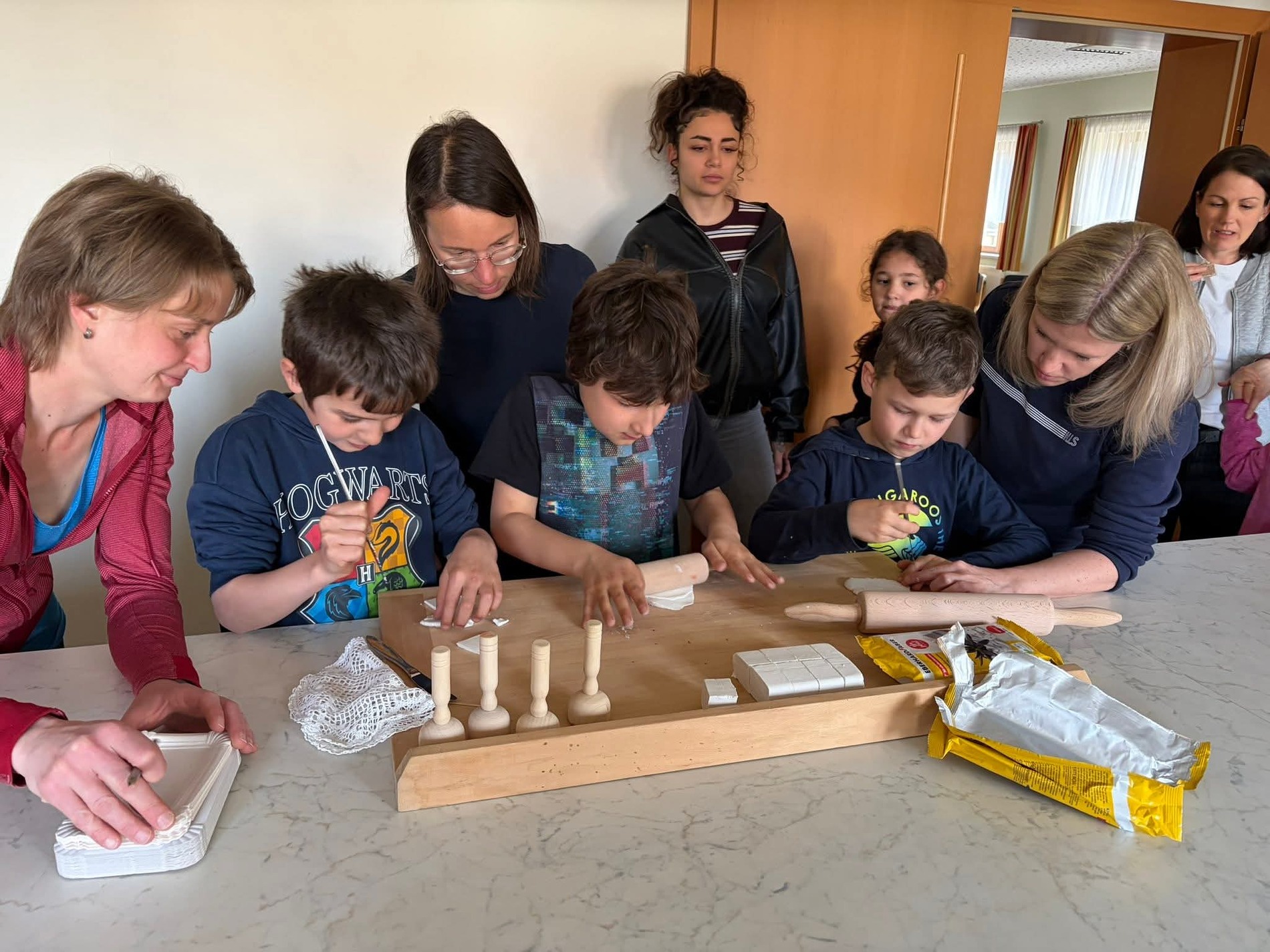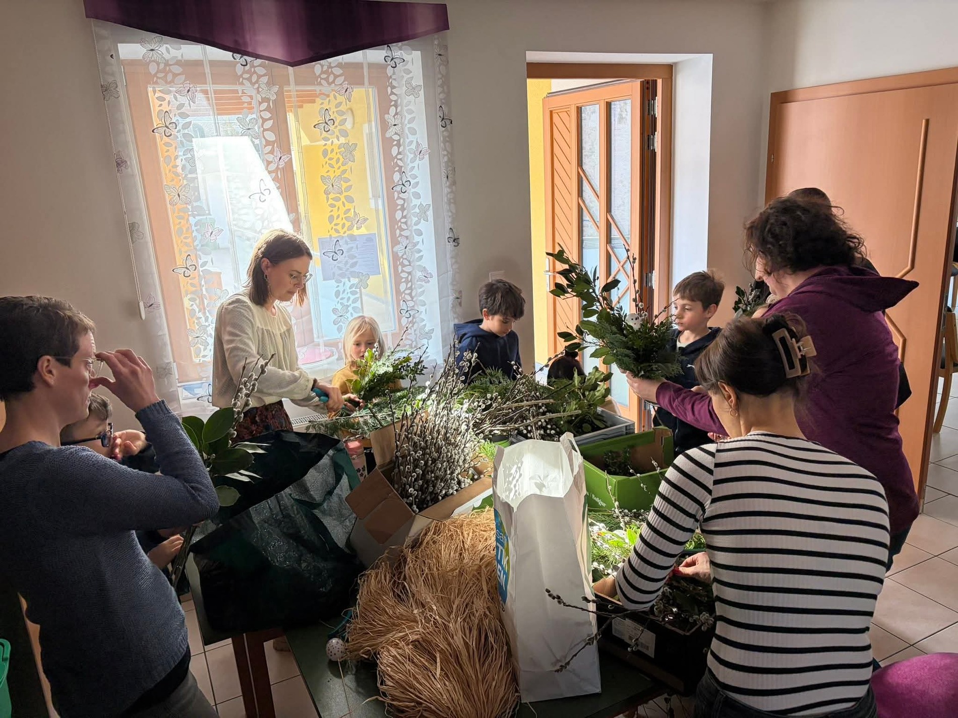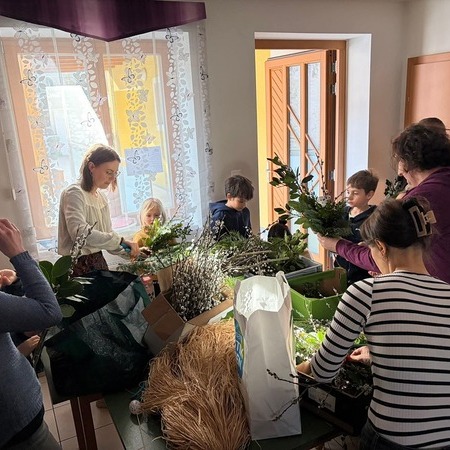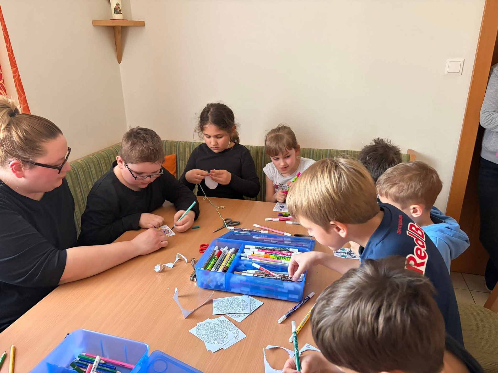 An verschiedenen Stationen wurde eifrig gewerkt: Es wurde gemalt, gezeichnet, gehäkelt, ausgeschnitten, gewalkt und gebunden. Die entstandenen Werkstücke präsentierten die Kinder schließlich in der Mitte des Raumes auf bunt gestalteten Tüchern.