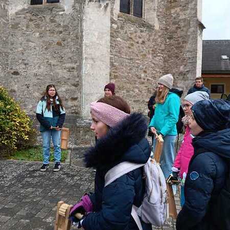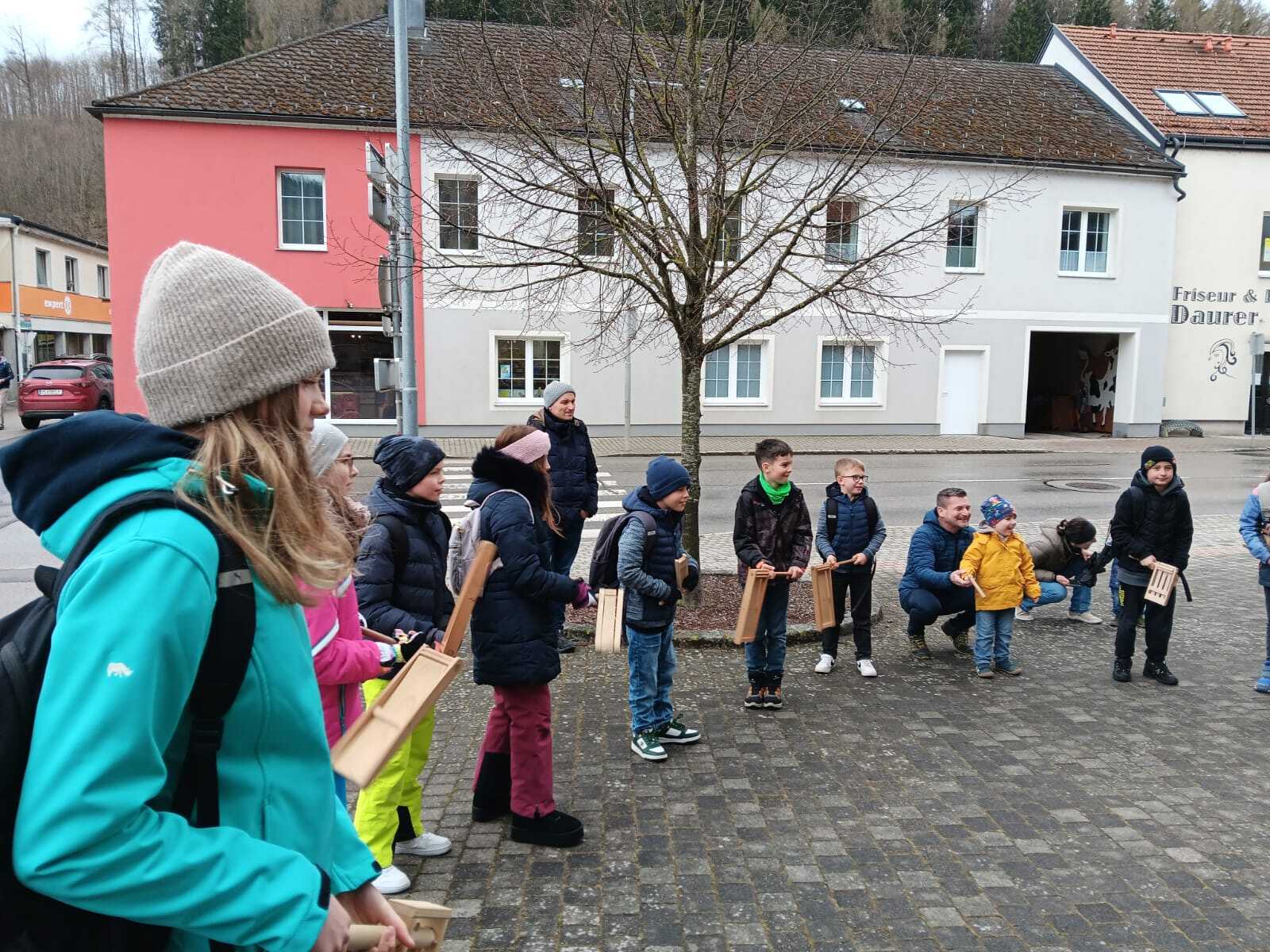 In Gruppen zogen die Kinder und Jugendlichen durch den gesamten Ort und erfüllten die Straßen mit dem charakteristischen Klang ihrer hölzernen Instrumente. Mit großem Engagement hielten sie so einen alten Brauch lebendig.