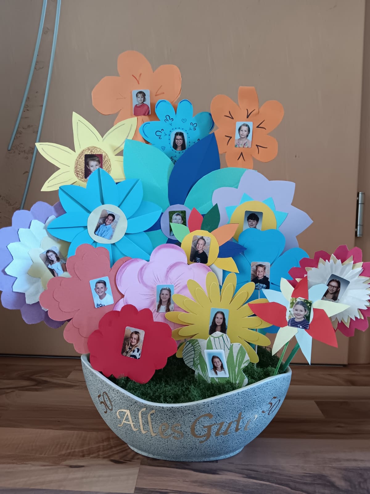 Von den Ministrant:innen erhielt er zudem einen „Blumenstrauß“ aus liebevoll gestalteten Papierblumen. Jede einzelne Blume war mit einem Foto eines Ministranten oder einer Ministrantin versehen. Ein herzlicher Dank gilt Michaela Riedl, die den Blumenstrauß organisiert und fertiggestellt hat.