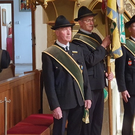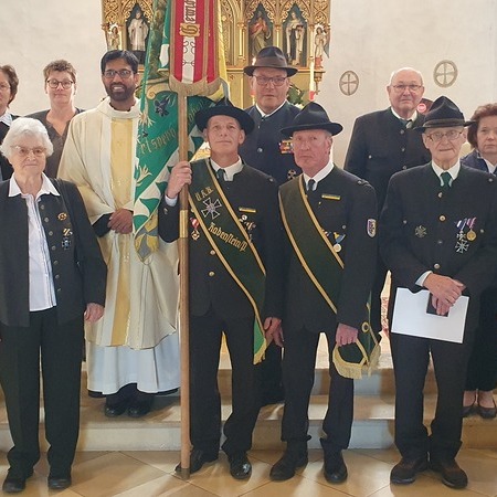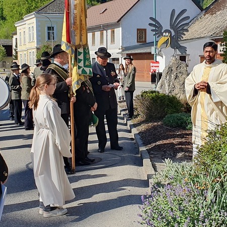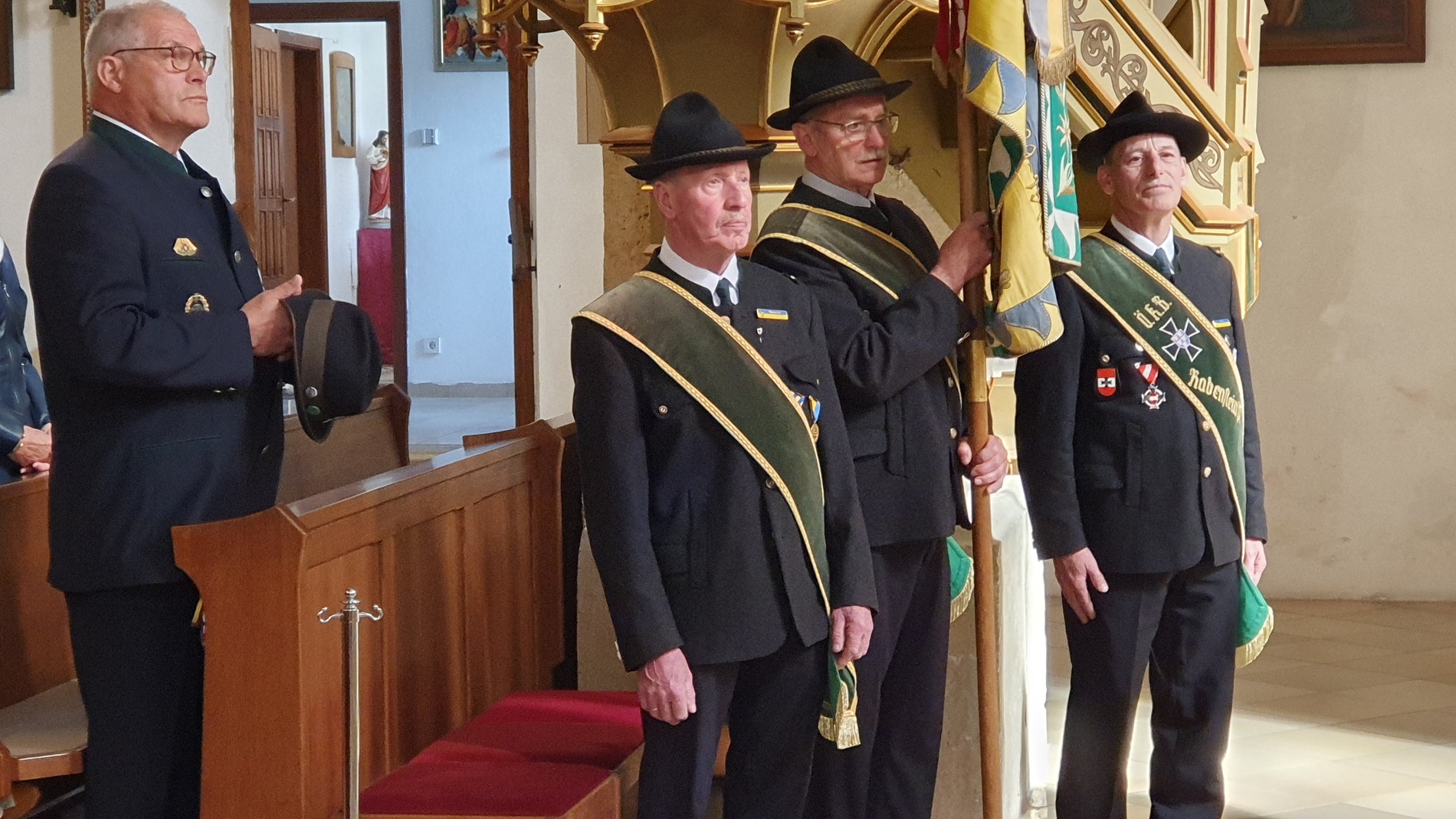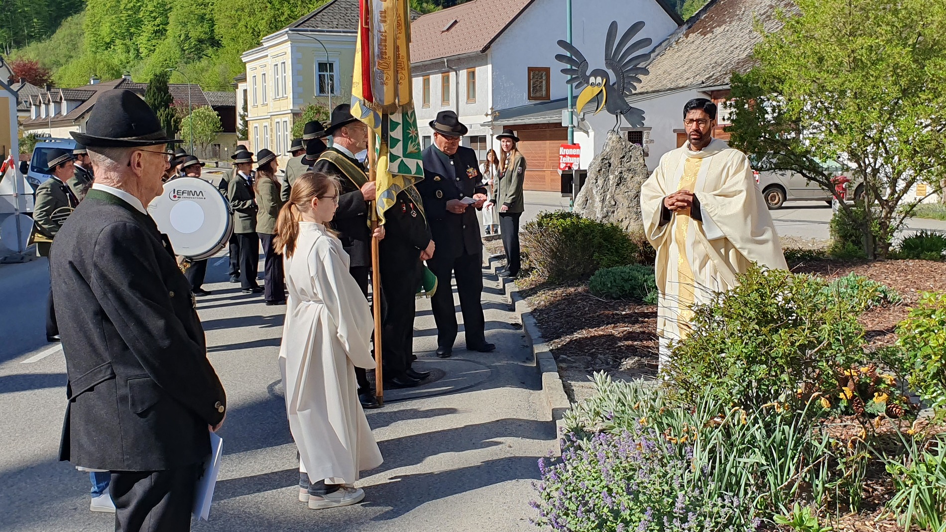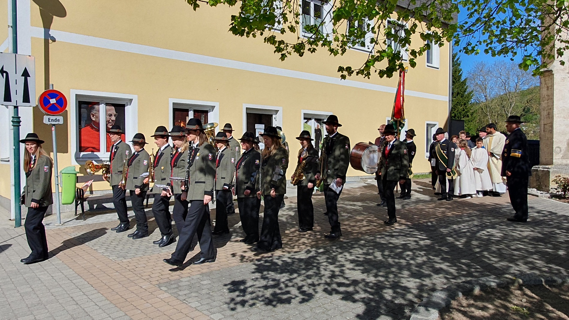 Nach dem feierlichen Festgottesdienst, der vom Musikverein Rabenstein musikalisch gestaltet wurde, zog der Festzug zum Friedensmahnmal, wo als sichtbares Zeichen des Gedenkens ein Kranz niedergelegt wurde.